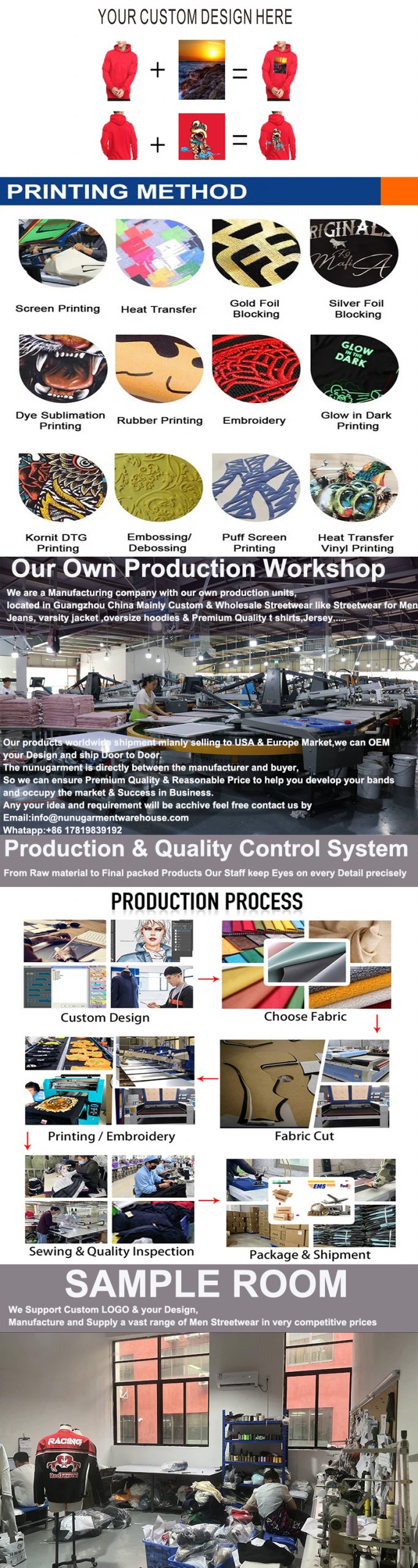 New Factory For Hot-Selling Street Wear/Any Customization Can Be Done Guangzhou Nunu garment warehouse is a professional men street wear clothes manufacturer, with more than 10 years of experience in production Knitwear for men.Our main products includes T shirts,hoodies,sweatshirts,jackets,pants and so on. Our factory offer fastest service in 7 days customized sample, 10-15 days finish bulk order. We provide one-step ODM&OEM Service with low MOO 50 pes per designs,and over 10 new collection development per week for your selection,all of our products 100% quality inspection before shipping to guaranteed quality. Any Customization can be done,wholesale and custom LOGO support,we willing to be your stronger and royalty supplier to build up your brands and help you improve the margin profit. Contact us for further discussion/ New collection catalog available Whatapp:+86 17819839192 Email: info@nunugarmentwarehouse.com